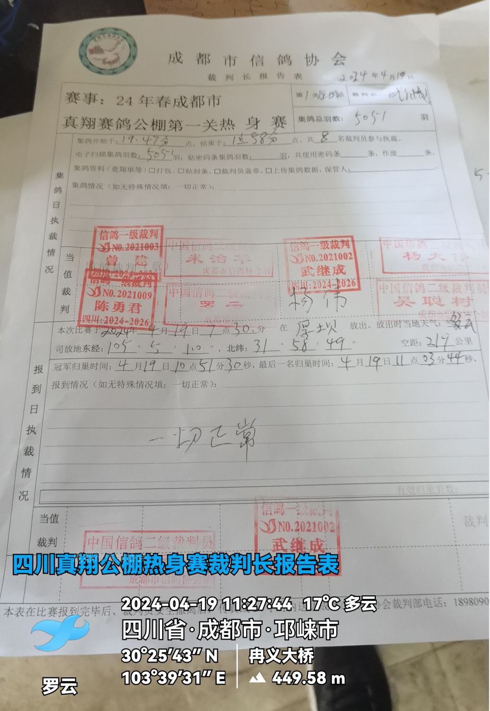 | 13 | 2023-04-0743687 | 火箭鸽勝-韩利斌☆ | 山西 大同 | 灰 | 2024-04-18 21:05:47.881 | 2024-04-19 10:52:54.918 | 1080.9683 |